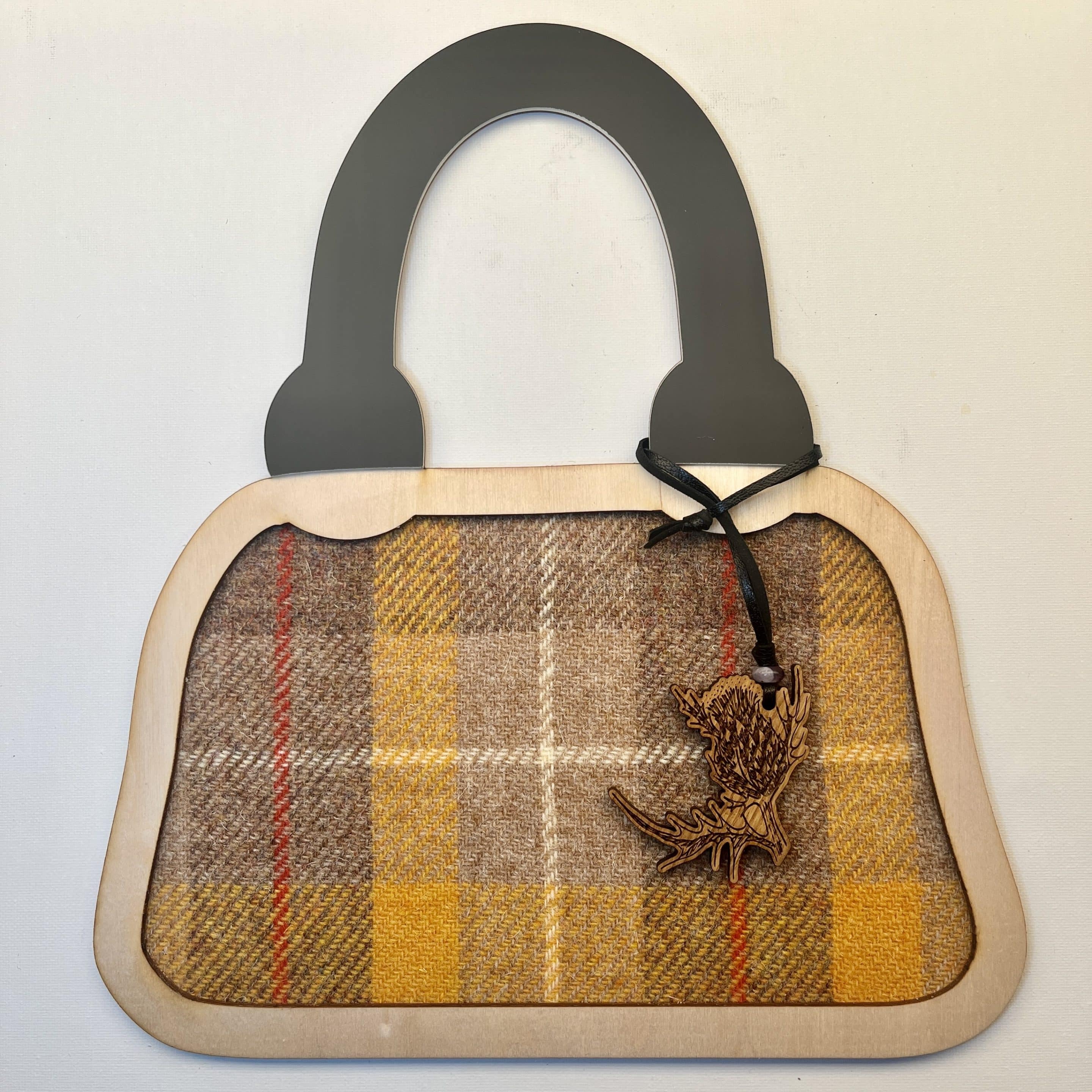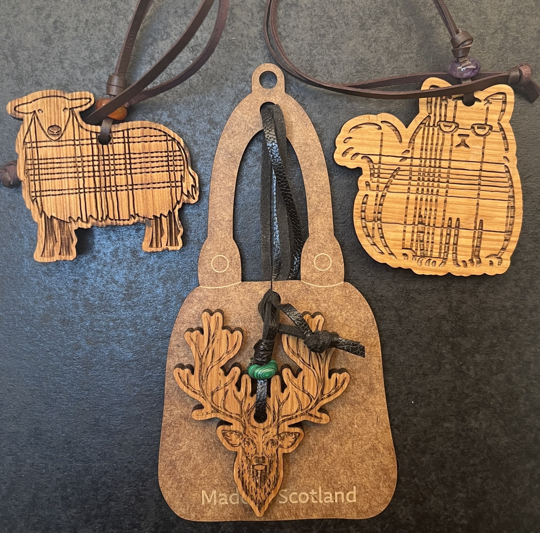 Whisky Barrel Bag Charms are made from recycled whisky barrels, cut, sanded and oiled in our workshop. Â They are topped by a Natural Stone bead and finished off with a long Genuine Leather thong. Â Natural beauty that is Made in Scotland. Â Choose from our lovely selection of Scottish designs.
